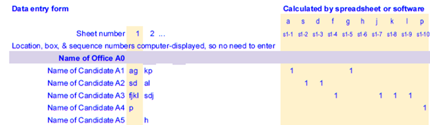 “Cause of America” prefers candidates be numbered on the ballots, so reader can call out the number for talliers to enter on sheet. New sheet for each 25 candidates. Video. Manual covers how these would be copied to summary sheet and added with a calculator.